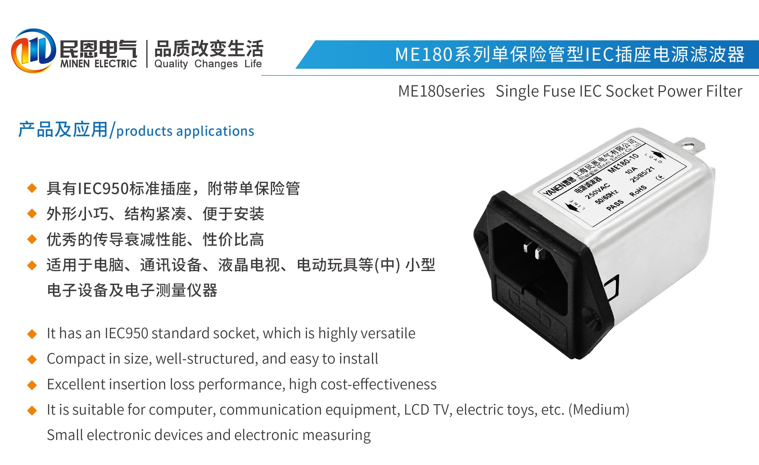 具有IEC950標準插座,附帶單保險管,外形小巧、結構緊湊、便于安裝,優秀的傳導衰減性能、性價比高。